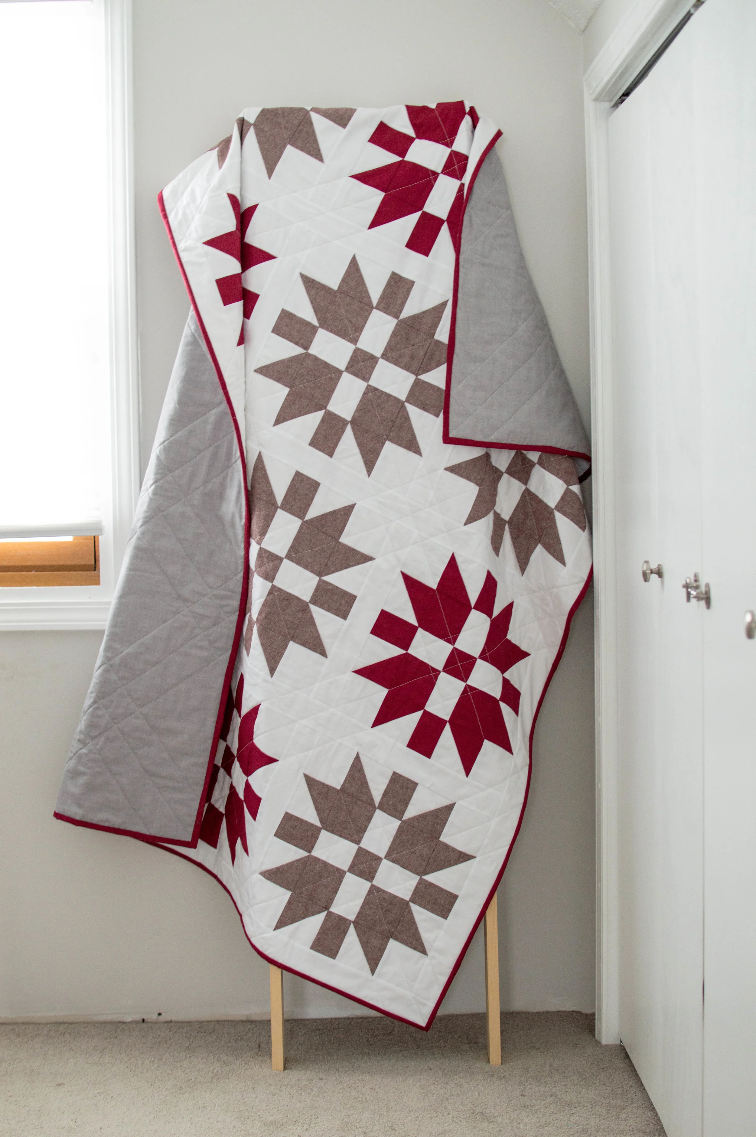 I'm normally not a block-and-sashing kind of quilter, but I just loved the clean lines of this quilt, and assembly-line block construction like these does go really quickly. I used Kona white and wine mixed with Essex linen in rust, which matched the wine really well. I think you could get away with anything from the wine to a dark burgundy to match this linen! My first intent was to back it with a navy Cotton + Steel print that was perfect, but, of course, sold out the day I tried to buy it. C'est la vie. I'm really happy with the shot-cotton gray I found though (and the little quilt store I now know about!), and I think it will help make this quilt a little less Christmas-y during not-December. I'm really happy with the quilting on this one- simple straight lines following the diagonal of the corner HSTs, which made cool designs where they intersected in the middle of the stars, in between the stars, and on the edges of the quilt. They look really nice against the gray on the back, too.